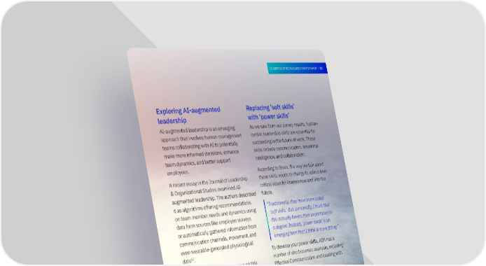 LEADERSHIP REIMAGINED WHITEPAPER | 33 Exploring AI-augmented Replacing ‘soft skills’ leadership with ‘power skills’ AI-augmented leadership is an emerging As we saw from our survey results, human- approach that involves human management centric leadership skills are essential for teams collaborating with AI to potentially succeeding in the future of work. These make more informed decisions, enhance skills include communication, emotional team dynamics, and better support intelligence, and collaboration. employees. According to Steve, the way we talk about A recent essay in the Journal of Leadership these skills needs to change to reflect their & Organizational Studies examined AI- critical value for leaders now and into the augmented leadership. The authors described future. it as algorithms offering recommendations “Traditionally, they have been called on team member needs and dynamics using ‘soft skills’. But, personally, I think that data from sources like employee surveys this actually lowers their importance to or automatically gathered information from a degree. Instead, ‘power skills’ is an communication channels, movement, and emerging term that I think is more 昀椀tting.” even wearable-generated physiological 63 To develop your power skills, AIM has a data . It’s a smart move to keep an eye on this number of short courses available, including innovative leadership approach. While it’s Effective Communication and Leading with an exciting development, it also raises some Emotional Intelligence. ethical questions that merit thoughtful consideration. 62 The Future of Jobs Report 2023, 2023, World Economic Forum, 63 The Now, New, and Next of Digital Leadership: How Arti昀椀cial Intelligence (AI) Will Take Over and Change Leadership as We Know It, 2023, Journal of Leadership & Organizational Studies