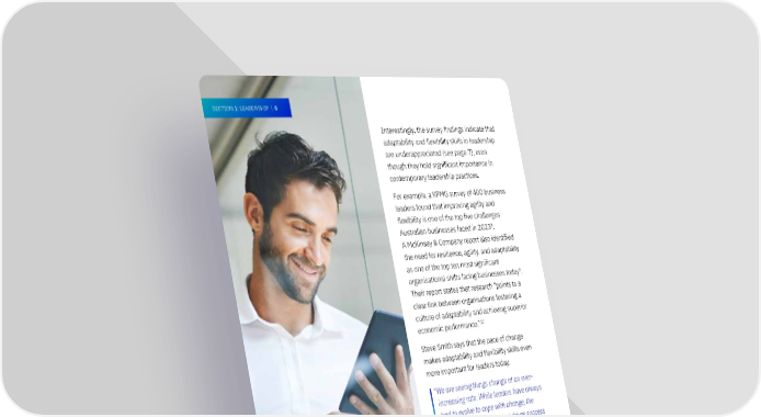 SECTION 1: LEADERSHIP | 8 Interestingly, the survey 昀椀ndings indicate that adaptability and flexibility skills in leadership are underappreciated (see page 7), even though they hold signi昀椀cant importance in contemporary leadership practices. For example, a KPMG survey of 400 business % leaders found that improving agility and 36 flexibility is one of the top 昀椀ve challenges AI is not a signi昀椀cant 8 consideration Australian businesses faced in 2023 . A McKinsey & Company report also identi昀椀ed the need for resilience, agility, and adaptability as one of the top ten most signi昀椀cant 9 organisational shifts facing businesses today . Their report states that research “points to a clear link between organisations fostering a culture of adaptability and achieving superior economic performance.”10 Steve Smith says that the pace of change makes adaptability and flexibility skills even more important for leaders today. “We are seeing things change at an ever- increasing rate. While leaders have always had to evolve to cope with change, the ability to keep pace is what drives success for leaders. They have to be able to thrive on change.” For leaders looking to enhance their adaptability and flexibility skills, AIM’s The Change Management – Embrace Evolve Thrive short course focuses on successful approaches to managing in a dynamic business landscape. You’ll learn how to lead change effectively and build resilient, agile organisations. 8 Keeping Us Up At Night - The Big Issues Facing Business Leaders in 2023, 2023, KPMG 9 The State of Organizations 2023, 2023, McKInsey & Company 10 The State of Organizations 2023, 2023, McKInsey & Company
