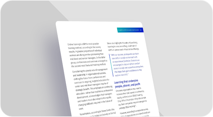 LEADERSHIP REIMALEADERSHIP REIMAGINED WHIGINED WHITEPTEPAPER | APER | 2323 Online training is still the most popular Steve also highlights the value of practising training method, according to the survey learning in a secure setting, a hallmark of results. A greater proportion of individual AIM’s in-person and virtual course offerings. workers are doing on-the-job training than “With our courses, participants can learn mid-level and senior managers. In the latter new skills in a safe environment with group, conferences and seminars emerged as an experienced facilitator. Students are the second most favoured training method. encouraged to step out of their comfort Considering the pivotal role of management zones in a safe and supportive atmosphere. and leadership in organisational success, This helps them gain con昀椀dence as they shifting the focus from conferences and explore new skills.” seminars to ongoing, targeted education for senior and mid-level managers may be of Learning that underpins strategic bene昀椀t. This emphasis on continuing people, planet, and pro昀椀t education, rather than traditional professional One area organisations may need to development, acknowledges that managers increase their L&D spend on is diversity, and leaders must also adapt to the rapidly equity, and inclusion (DE&I) training. changing skill sets required in the future of Only 39% of Australian HR professionals work. say their companies require managers to 41 Nonetheless, according to Steve Smith, this undergo DE&I training . doesn’t mean focusing exclusively on formal However, according to a separate survey, education training methods. 41% of respondents considered employee “It’s not necessarily about suddenly wellbeing the primary business case for 42 dedicating huge amounts of L&D time to DE&I . And as we discussed in Chapter being in a classroom. It’s really important Two, employee engagement is vital to to start with a foundation that is practical in organisational success. nature and not just theory,” he says. In the next chapter, we’ll explore key trends “While theory certainly has its place, it can in DE&I and also take a closer look at another be incredibly bene昀椀cial to jump into hands- critical area for Australia’s leaders and on experiences to start practising what managers: environmental sustainability. we’ve learned.” 41 The State of Diversity, Equity and Inclusion in Australian Workplaces, 2023, Australian HR Institute, 42 Global Blueprint for Belonging and Diversity, 2022, Workday