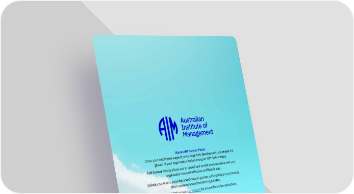About AIM Partner Packs Show your employees support, encourage their development, and enable the growth of your organisation by becoming an AIM Partner today. AIM Partner Pricing allows you to upskill and re-skill more people across your organisation in a cost-effective and flexible way. Unlock your team’s potential and choose to partner with AIM by pre-purchasing short course or accredited training bundles. Call 1300 658 337 or visit our website for more information and advice. About AIM The Australian Institute of Management (AIM) empowers individuals and organisations to adapt and thrive in the face of relentless change. Since 1941, AIM has supported Australia’s workforce by providing innovative and industry-focused education solutions. Our portfolio of short courses, quali昀椀cations, and higher education is constantly evolving to ensure we are best positioned to support our customers. Upskill or re-skill your organisation with AIM and seize the future. Australian Institute of Management Education and Training Pty Limited (AIM); ABN 40 009 668 553; Ground Floor, 7 Macquarie Place, Sydney, NSW, 2000; AIM is a Registered Training Organisation, RTO Code 0049. The AIM Business School is a registered Institute of Higher Education, Provider ID: PRV12071, and an approved FEE-HELP provider.