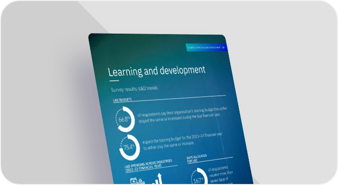 LEADERSHIP REIMAGINED WHITEPAPER | 19 Learning and development Survey results: L&D trends L&D BUDGETS 66.8% of respondents say their organisation’s training budget has either stayed the same or increased during the last 昀椀nancial year. 75.4% expect the training budget for the 2023–24 昀椀nancial year to either stay the same or increase. L&D SPENDING ACROSS INDUSTRIES DAYS ALLOCATED (2022–23 FINANCIAL YEAR) FOR L&D of respondents 16.7% receive more than HEALTHCARE seven days of training per year. MANUFACTURING TOP TWO L&D IMPLEMENTATION CHALLENGES CONSTRUCTION Time availability of employees (68%) NON-PROFIT Budget limits (50%) GOVERNMENT