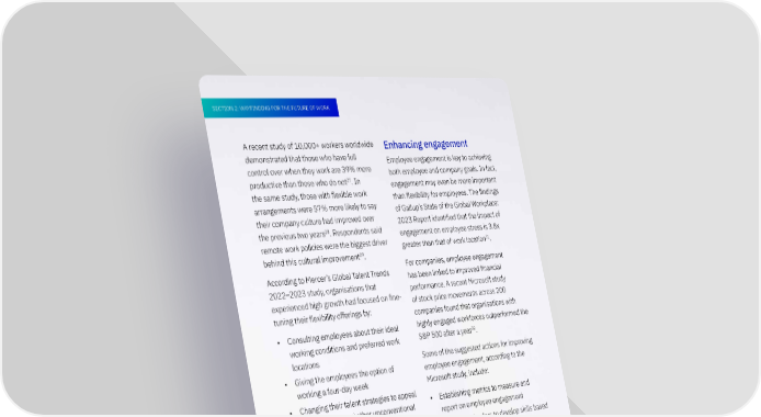 SECTION 2: WAYFINDING FOR THE FUTURE OF WORK A recent study of 10,000+ workers worldwide Enhancing engagement demonstrated that those who have full Employee engagement is key to achieving control over when they work are 39% more both employee and company goals. In fact, 27 productive than those who do not . In engagement may even be more important the same study, those with flexible work than flexibility for employees. The 昀椀ndings arrangements were 57% more likely to say of Gallup’s State of the Global Workplace: their company culture had improved over 2023 Report identi昀椀ed that the impact of 28 the previous two years . Respondents said engagement on employee stress is 3.8x remote work policies were the biggest driver 31 greater than that of work location . 29 behind this cultural improvement . According to Mercer’s Global Talent Trends For companies, employee engagement 2022–2023 study, organisations that has been linked to improved 昀椀nancial experienced high growth had focused on 昀椀ne- performance. A recent Microsoft study tuning their flexibility offerings by: of stock price movements across 200 companies found that organisations with • Consulting employees about their ideal highly engaged workforces outperformed the 32 working conditions and preferred work S&P 500 after a year . locations Some of the suggested actions for improving • Giving the employees the option of employee engagement, according to the working a four-day week Microsoft study, include: • Changing their talent strategies to appeal • Establishing metrics to measure and to freelancers and other unconventional report on employee engagement talent sources • Supporting leaders to develop skills based • Adapting their workspaces to better on best practices for achieving employee support a hybrid work model with a engagement stronger focus on technologies. • Setting goals for managers to achieve 30 • Embedding flexibility into cultural norms around engagement • Sharing engagement metrics with managers so they can implement 33 solutions If you want to gain more insights into the best strategies and actions to effectively engage with employees at every stage of their journey, our People and Culture for Managers short course is an ideal starting point.