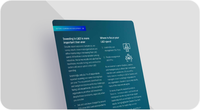 SECSECTTION 1: LEADERSHIP | ION 3: LEARNING AND DE20 VELOPMENT | 20 Investing in L&D is more Where to focus your important than ever L&D spend Despite recent economic turbulence, our survey results show most organisations are 1. Leadership and either maintaining or increasing their L&D management (54.71%) spend. While there is some variation among industries, the survey results indicate that the 2. People management healthcare, manufacturing, and construction (40.97%) sectors will see an uptick in their L&D spending. As we covered in earlier chapters, leaders and managers play a critical role in employee Surprisingly, only 16.7% of respondents retention and satisfaction. It’s one of the reported receiving over seven training days many reasons investing in L&D for leaders and per year. The respondents identi昀椀ed time managers is such a strategic imperative for and budget constraints as the top challenges any organisation. Based on our survey results, facing L&D departments. It’s crucial that many of the respondents agree. organisations prioritise L&D investment In terms of speci昀椀c leadership skills to despite these constraints, especially when focus on, ‘communication’ and ‘emotional you consider: intelligence’ are the top two most-valued • Job skill sets have changed by around leadership skills according to our 2023 survey 25% since 2015 and are expected to results. As highlighted in Chapter One, both 35 double by 2027 . skills are vital for leadership success. • 86% of business leaders in PwC Another key L&D key priority, according to Australia’s 26th CEO Survey said they are Steve Smith, Executive Director for AIM Future 36 invested in upskilling their workforce . Skills, is ensuring that leaders and managers • 89% of L&D professionals agreed that are well-versed in technology. “proactively building employee skills for today and tomorrow will help navigate “I think the one thing we can’t get away from the evolving future of work”, according is the fact that technology is becoming more to LinkedIn’s 2023 Workplace Learning critical to leadership,” he says. 37 Report . “From having the ability to harness and • 75% of employees say they’d stay at their interpret data to recognising the potential company longer if they could receive more of technology to bene昀椀t your organisation, L&D support, according to recent Microsoft leaders today must embrace technological research38 . pro昀椀ciency. The future demands that leaders be tech-savvy.”