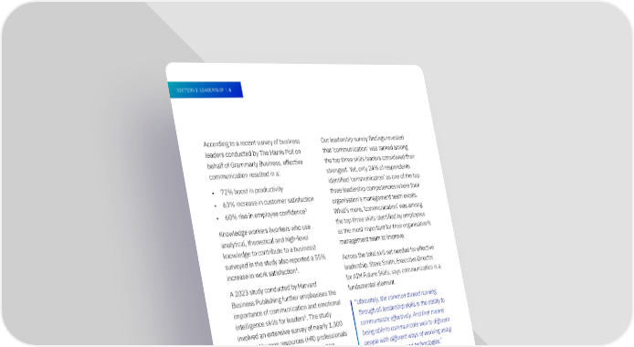 SECTION 1: LEADERSHIP | 6 According to a recent survey of business Our leadership survey 昀椀ndings revealed leaders conducted by The Harris Poll on that ‘communication’ was ranked among behalf of Grammarly Business, effective the top three skills leaders considered their communication resulted in a: strongest. Yet, only 24% of respondents • 72% boost in productivity identi昀椀ed ‘communication’ as one of the top • 63% increase in customer satisfaction three leadership competencies where their organisation’s management team excels. • 60% rise in employee con昀椀dence3 What’s more, ‘communication’ was among Knowledge workers (workers who use the top three skills identi昀椀ed by employees analytical, theoretical and high-level as the most important for their organisation’s knowledge to contribute to a business) management team to improve. surveyed in the study also reported a 55% Across the total skill set needed for effective 4 increase in work satisfaction . leadership, Steve Smith, Executive Director A 2023 study conducted by Harvard for AIM Future Skills, says communication is a Business Publishing further emphasises the fundamental element. importance of communication and emotional “Ultimately, the common thread running 5 intelligence skills for leaders . The study through all leadership skills is the ability to involved an extensive survey of nearly 1,300 communicate effectively. And that means L&D and human resources (HR) professionals being able to communicate well to different and functional heads from Fortune 500 people with different ways of working using 6 companies . The 昀椀ndings revealed that different mediums and technologies.” ‘empathic communication’ and ‘emotional and social intelligence’ ranked among the top “As managers and leaders, we have to be three most in-demand leadership skills for able to communicate in the moment in 7 compelling ways. We’ll also need to start addressing business challenges . collaborating in new ways, as this is an area While the study results show communication that is going to rapidly evolve.” is highly valued as a leadership skill, leaders’ and employees’ perceptions about communication abilities differ. 3 The State of Business Communication, 2023, The Harris Poll and Grammarly Business 4 The State of Business Communication, 2023, The Harris Poll and Grammarly Business 5 2023 Global Leadership Development Study, Harvard Business Publishing 6 2023 Global Leadership Development Study, Harvard Business Publishing 7 2023 Global Leadership Development Study, Harvard Business Publishing